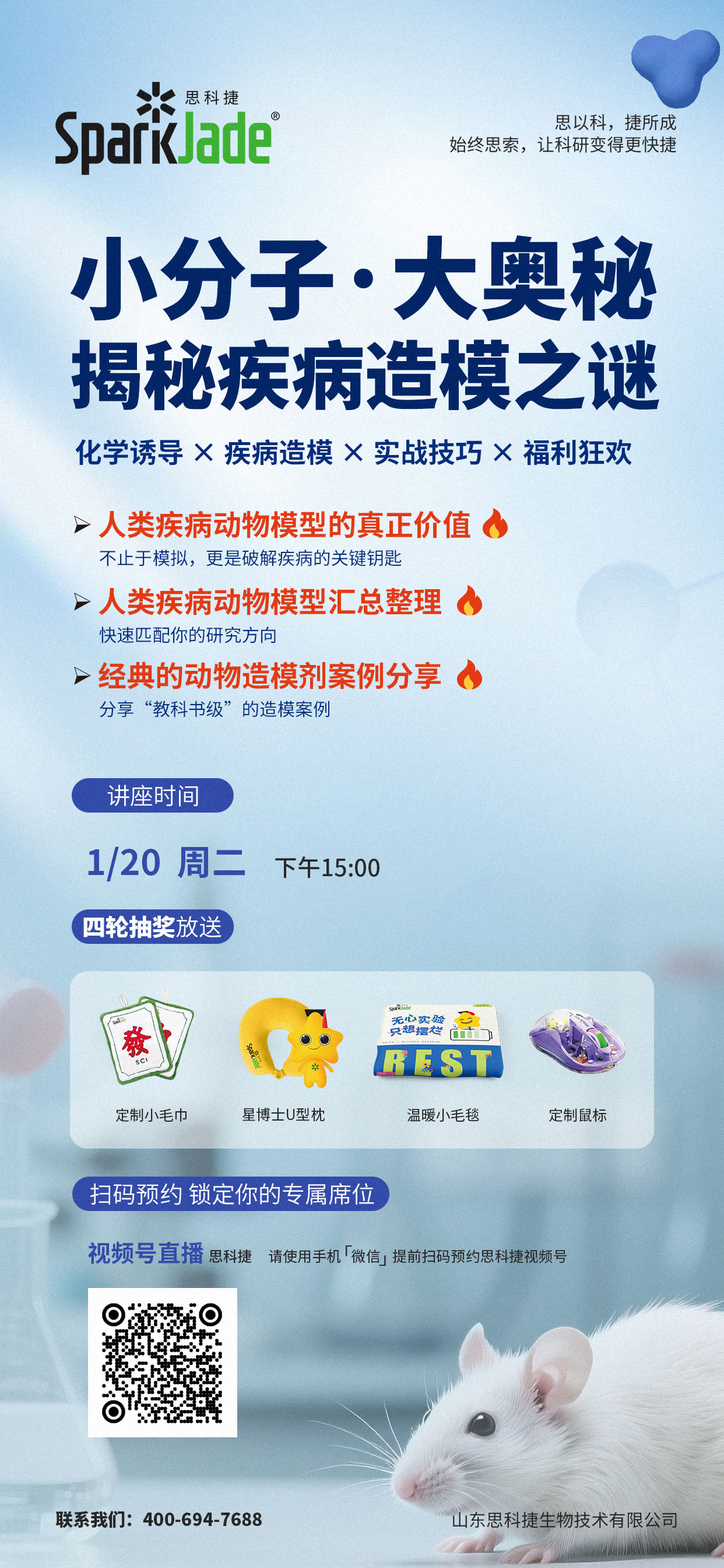 为了让大家更好的理解动物造模剂,我们在1.20号(周二)下午3点安排了一场关于造模的直播讲座,讲座期间积极互动,还有礼品相送,快来预约吧。