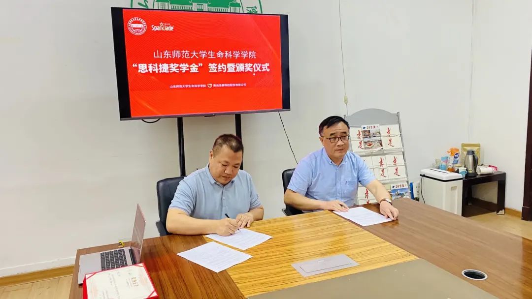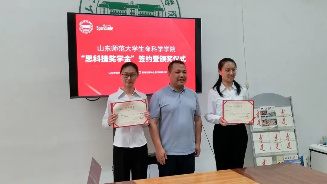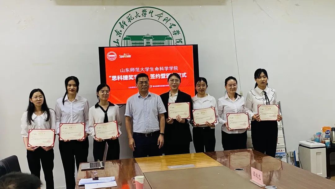 2021年6月15日,在山东师范大学生命科学学院举行了“思科捷”奖学金签约暨颁奖仪式。出席此次签约仪式的有生命科学学院党委书记于铁、院长杨桂文、党委副书记谭效忠、团委书记师静、青岛浩赛科技股份有限公司董事长张小波、山东思科捷生物技术有限公司总经理徐宜铁。