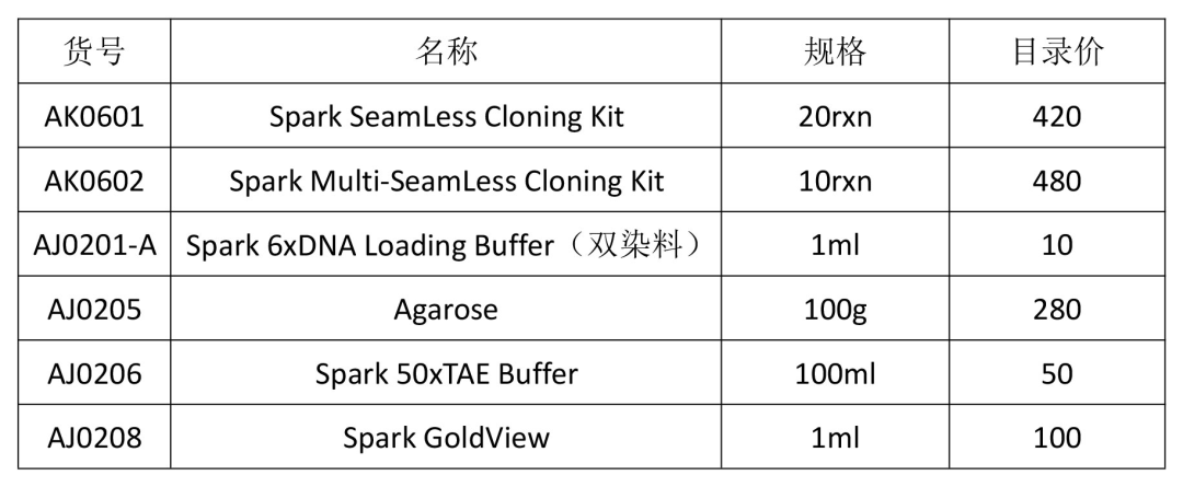 本次直播,应大家的要求,选择的是同源重组克隆实验。实验中主要采用的是思科捷AK0601。该产品不依赖于T4连接酶,不受载体和目的片段的酶切位点的影响,可以在任何位置进行克隆,并且高效准确,阳性率高。有需要的小伙伴赶紧买它买它买它!同时下方是今天实验过程中用到的部分思科捷产品,大家有需要可咨询相关地区业务员。