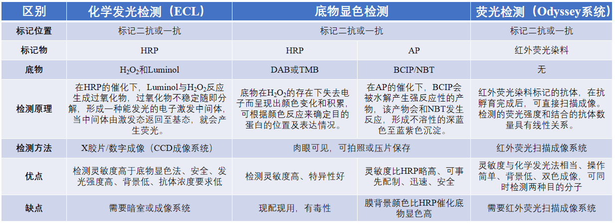 WB常用的检测方法主要有:化学发光检测、底物显色检测和荧光检测(Odyssey系统),实验室最常用的则是化学发光检测。