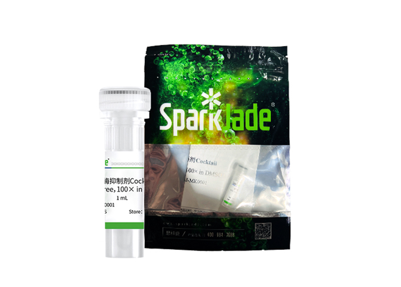 本蛋白酶抑制剂Cocktail(EDTA-Free,100× in DMSO)含有6种广谱蛋白酶抑制剂,包括丝氨酸蛋白酶、半胱氨酸蛋白酶、酸性蛋白酶、氨肽酶等,可以抑制绝大多数蛋白酶活性,保护蛋白完整性。适用于从哺乳动物组织、细胞中提取蛋白质,能够更有效的获得目的蛋白。